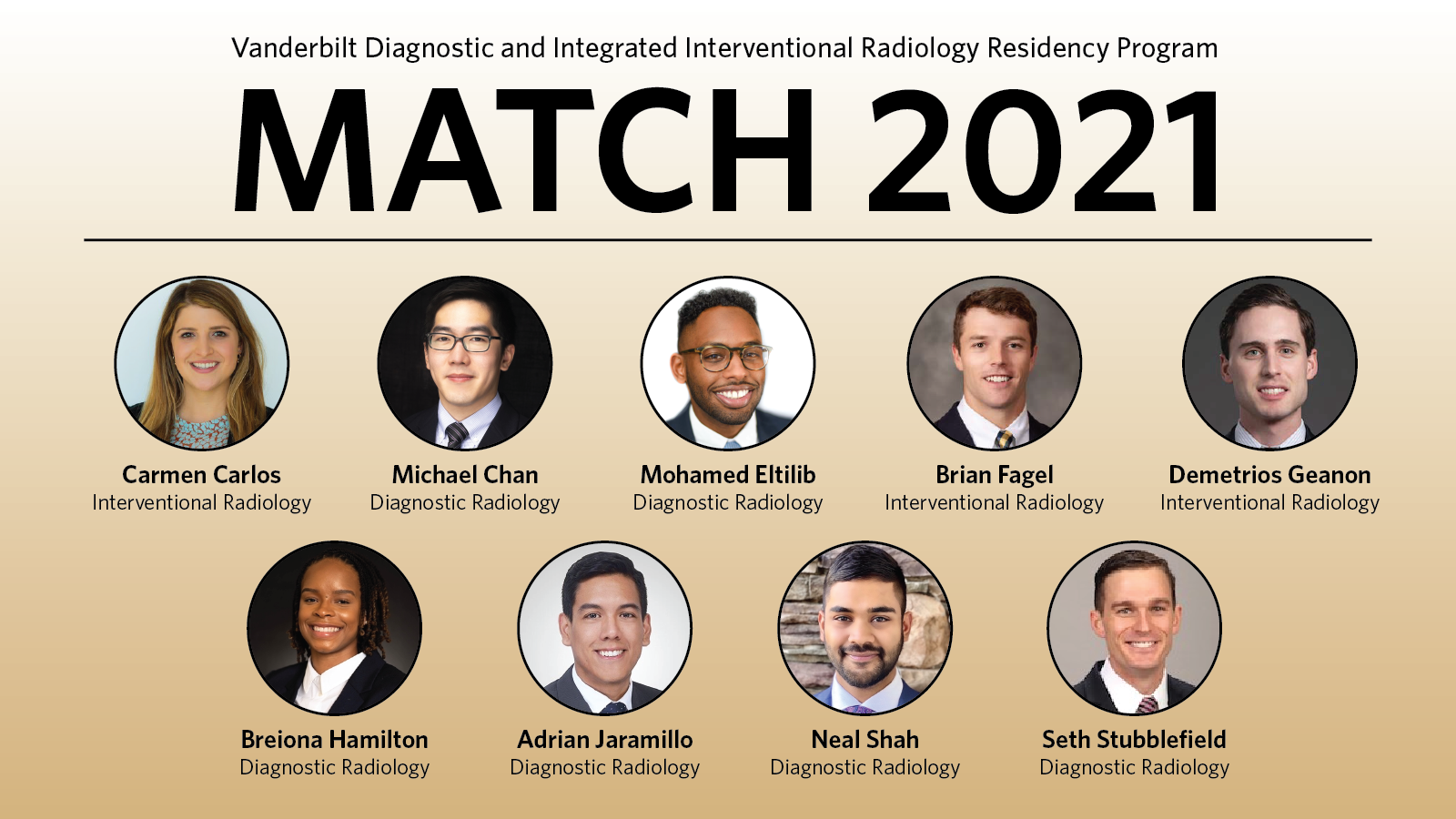 “The 2021 Match interview cycle was like many other unprecedented experiences over the past year,” said Ryan Muller, MD, Assistant Professor of Radiology and Program Director of the IR Residency. “We are deeply grateful for the commitment of our faculty, residents and applicants who worked together to make the best of the suboptimal virtual format. Those logistics aside, we were thrilled to see one of the strongest applicant pools of any specialty, and were privileged to speak with some of the brightest medical students in the country. We could not be more elated with our match results and are eager to welcome them to the Vanderbilt IR family!”